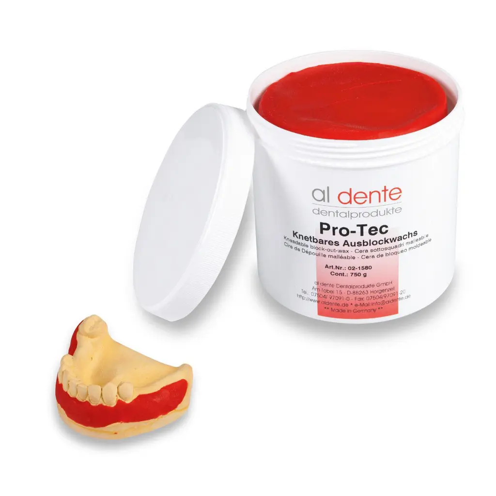 Knetbares Wachs, beim Duplieren (Modellgusstechnik): zum Ausblocken von Unterschnitten sowie bei der Herstellung von lichthärtenden Basisplatten. Es ist plastisch formbar, daher einfach in der Anwendung. Pro-Tec ist wiederverwendbar, einfach abzudampfen. ProTec ist selbstisolierend gegen Silikon, Kunststoff und Gips. Ersparnis an Zeit und Dupliermaterial.
